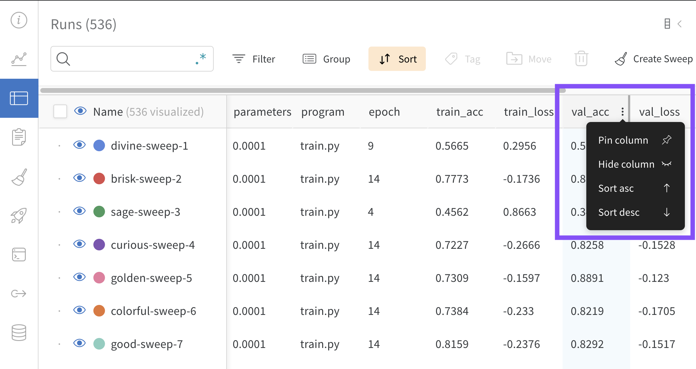 앞의 이미지는 val_acc라는 테이블 열에 대한 정렬 옵션을 보여줍니다.